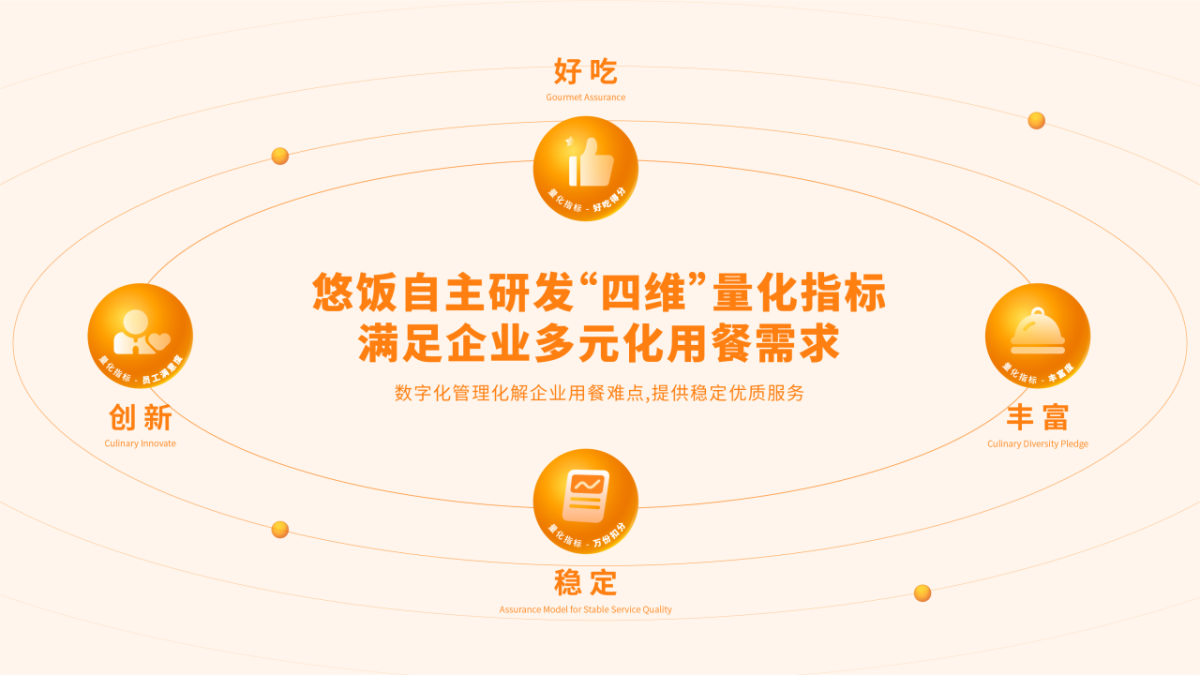 悠饭通过自主研发的“四维”量化指标体系:好吃、丰富、稳定、创新,为团餐行业树立了新的发展标杆。不仅提升了服务品质,更成为团餐行业新标准的制定者。以更有针对性的好吃得分、丰富度、万份扣分、员工满意度等量化标准,真正解决餐饮供应链管理难题,并形成了与之匹配的SOP标准、服务运营体系,为商家深度赋能,为用户提供高品质用餐体验。
