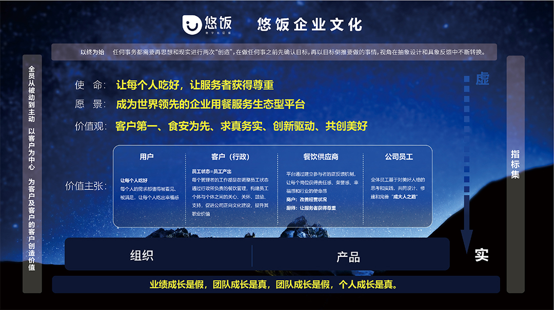 悠饭将始终秉持“客户第一、食安为先、求真务实、创新驱动、共创美好”的价值观,以坚定的信念与饱满的热情,践行“让每个人吃好”的价值主张。